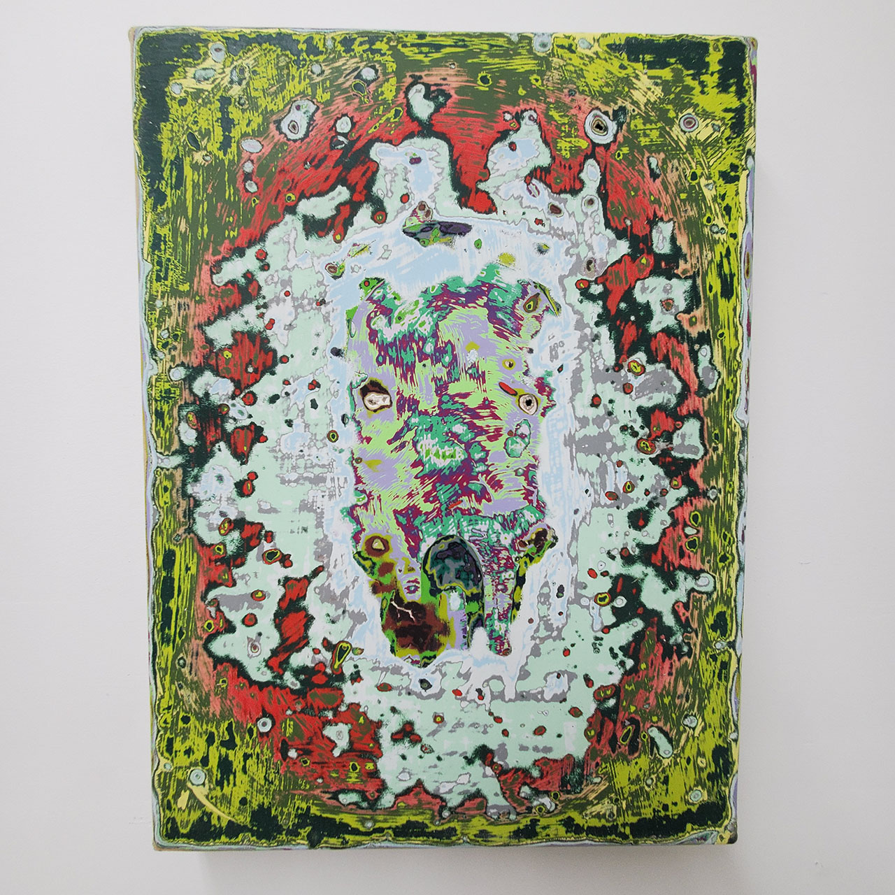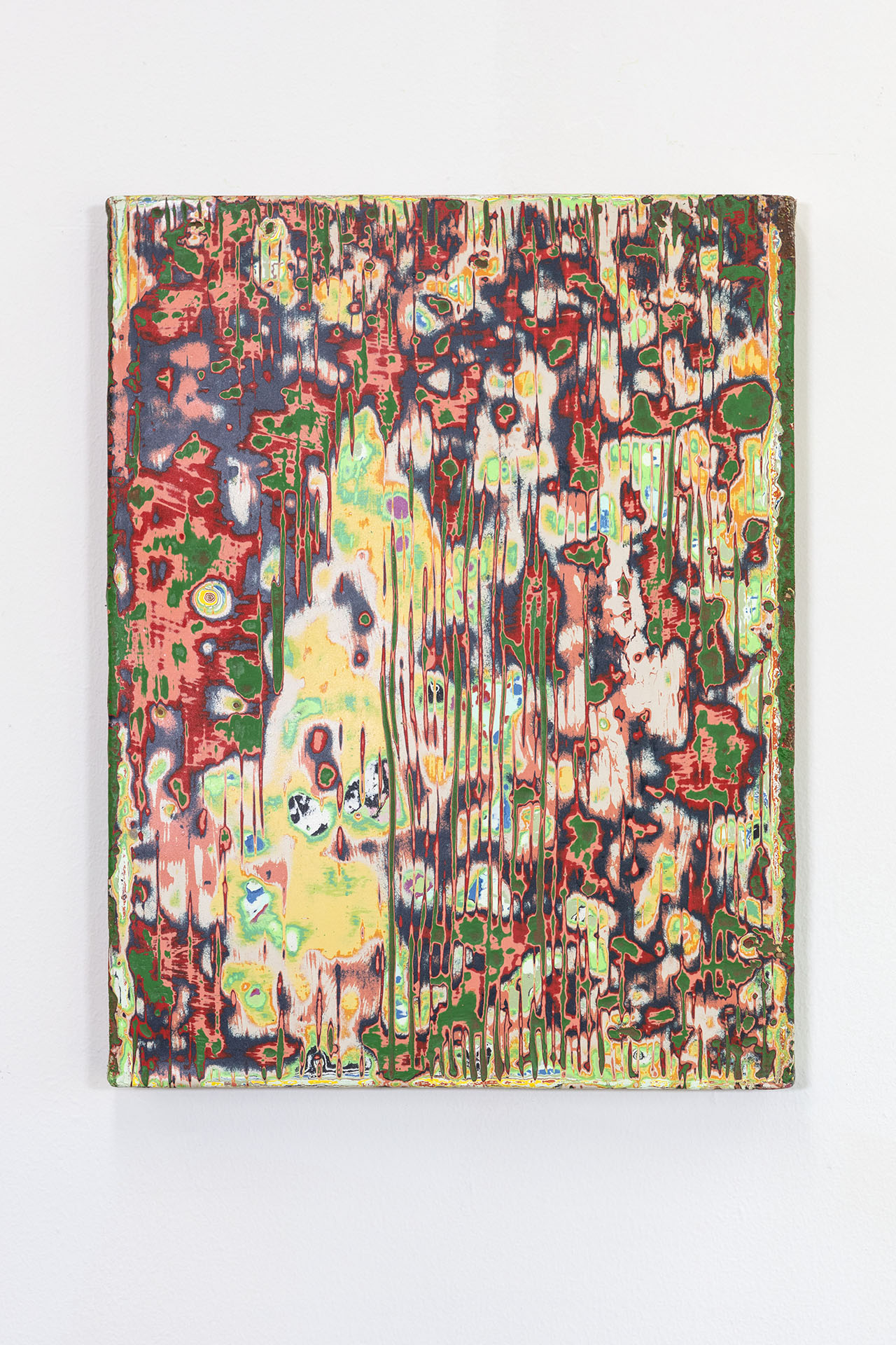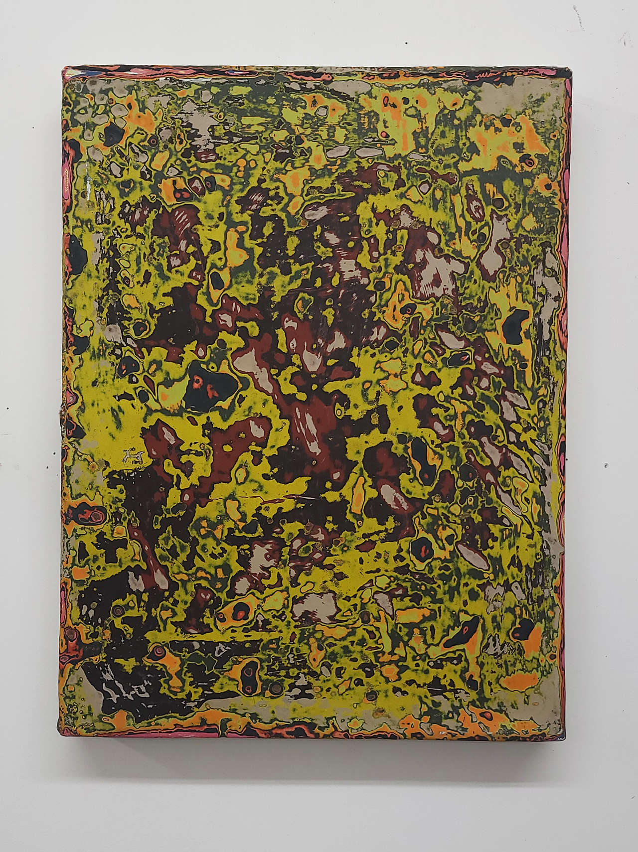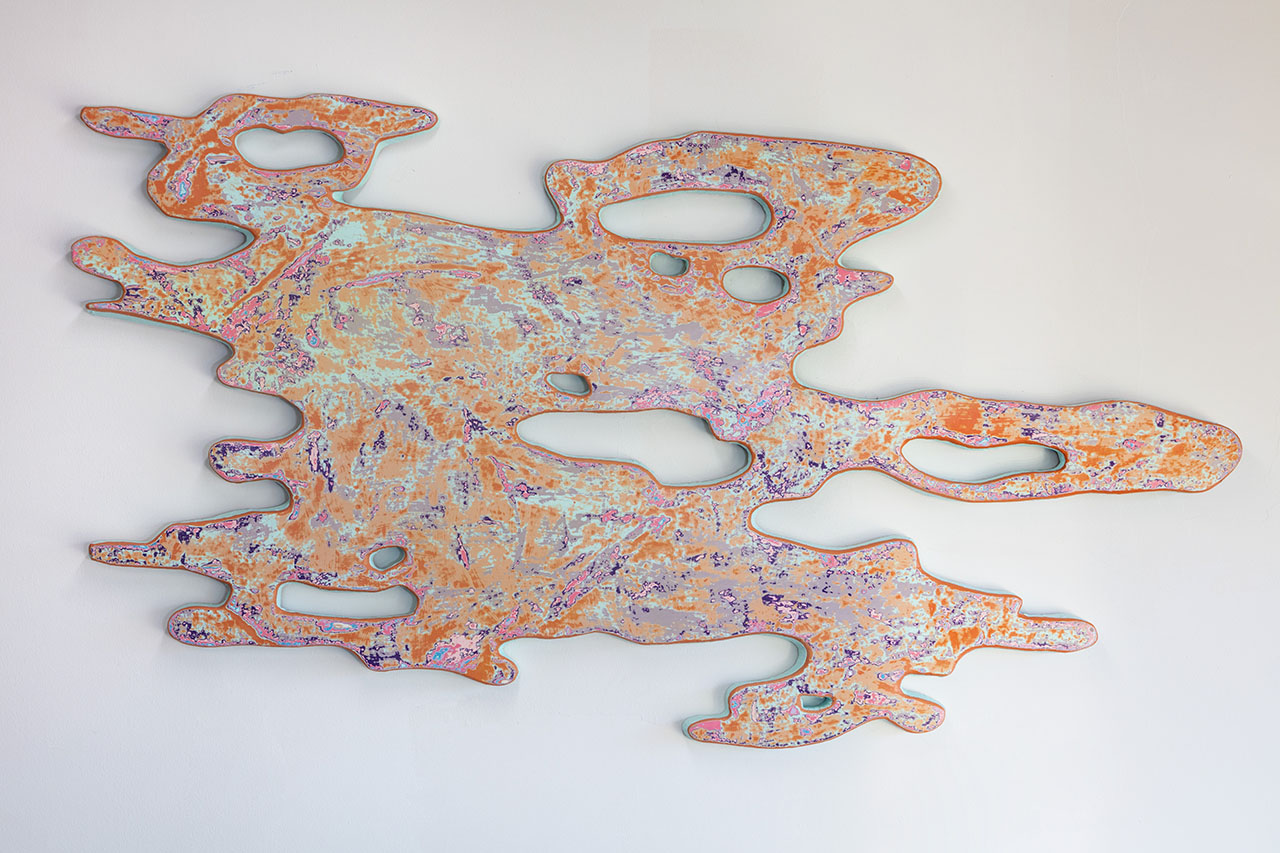 I begin a painting by adding layer by layer an accumulation of paint. Over time, these accumulations are eroded, just like how sand or soil is made beneath our feet. Like memories, multiple layers and erosion events pile on each other to create an image composite of visual time. This method of terrain-making, or painting, is the vein that runs through all of my work.